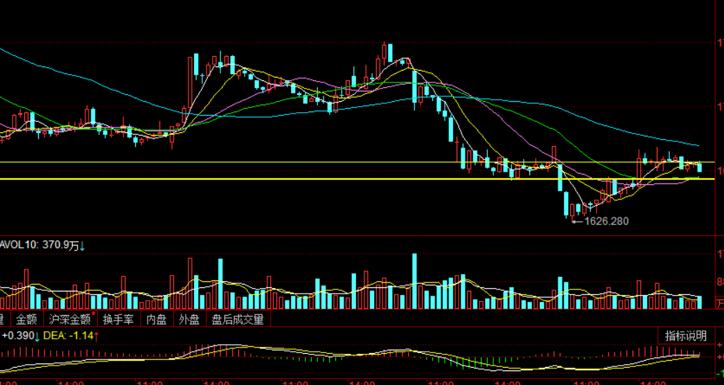 我们看到证券在颈线上挣扎了几个半小时后又回到箱体整理,现在就看MA20上穿MA5的金叉能不能给他一些力量,金叉应该在今天出现