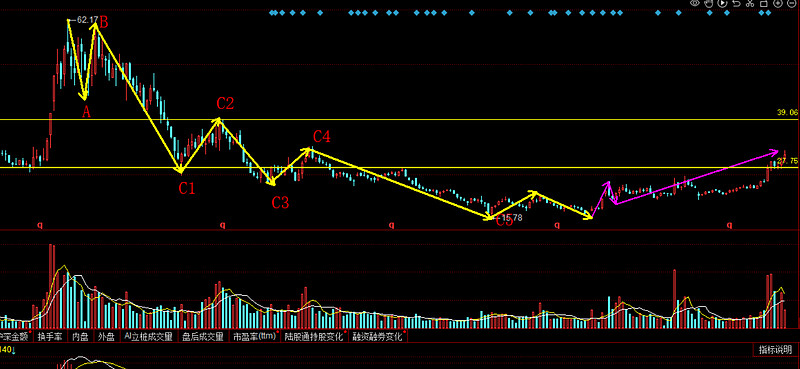 昨天聊到正泰电器,只是没有很正式的分析,今天补上,首先我们看看正泰的波浪分析,从21年的牛市顶部下来,ABC5浪级很清晰,所以我们现在所处的位置也就比较清晰了,现在正处于上升五浪的33浪,33浪往往都是主升浪,符合我们选股标准,只吃主升浪(谁跟他玩夹头那套,死拿着一支标的三四年坐过山车,一轮牛市过了,还没回到三年前的高度),所以这是一个大前提,在大方向有个粗浅判断后,我们再来看看他的日K图。
