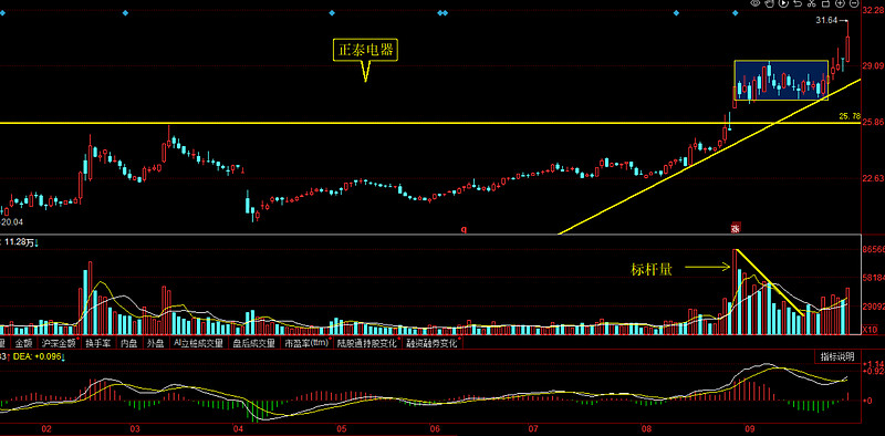 日K显示三月份有试盘出现,然后洗盘吸筹五个月,底部缓慢抬高,826,827两根长上影,828一个放天量板,共同组成一个仙人指路组合,随后一个月的洗盘,并没花费多长时间就洗去浮筹,显然一致性不错,同时MACD在水上金叉,接着开始主升浪,整体脉络非常清楚,确定性强,结合基本面(粗粗了解,今年的业绩有明显的上升,以上半年翻倍来计算,今年就有五十亿净利),进一步印证我们的分析,吃口肉的可能性还是比较大的。