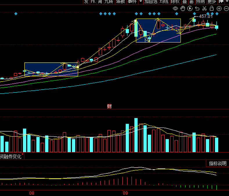 下面这图是中某某创,大牛中的牛代表,前面的图我就不画出来了,只画与逃顶相关的两个中枢,两个很清晰的中枢出来后,最后还有个新高,这个新高有很大的迷惑性,是不是新高出来了还会有行情,而事实上这里是非常明显的背驰,而457也是1卖。这个点位是非常清晰的,当然你也可以说,当天不好拿捏,而事实上后面的两天价格都相差不大,是有很多机会出走的,这就是龙头的好处,出逃机会多的是。最后的三天已经连续三天跌破五日线,这就更加清楚了。