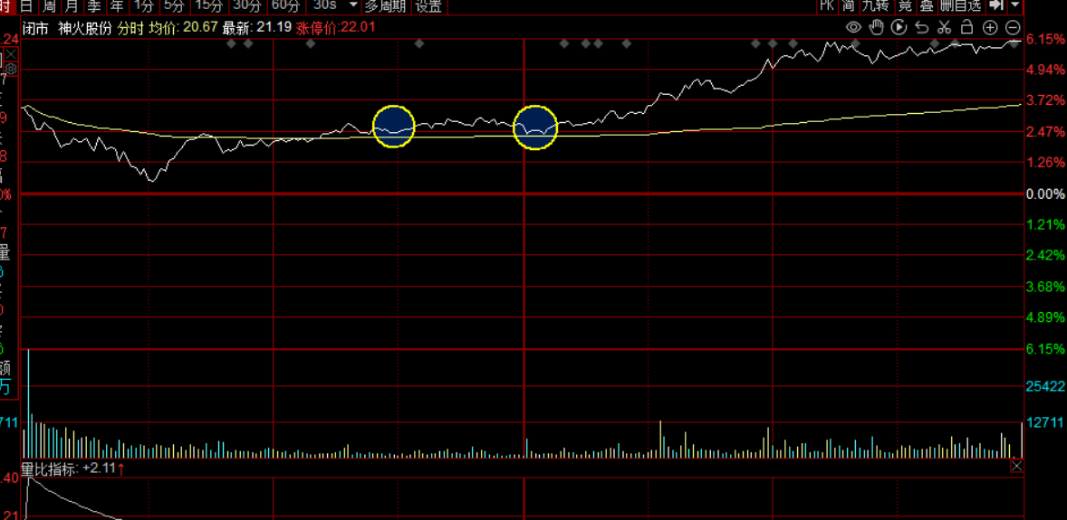 说一个盘中买点的小窍门,昨天神火为什么要在那个位置买,首先,开新仓一般不在上午买买入,因为一旦当天大跌,你连跑的机会都没有,所以通常在午后收盘前建仓,这样安全系数高,那为什么会在下午开盘不久就买呢,看下图的圆圈,早盘高开,向下调整然后缓升到分时均线上下,早盘十一点左右,一次回调到均线,没有跌破反弹,下午开盘不久再一次回调到均线,依然没有跌破,这就基本可以确认今天尾盘还有上升空间,所以在那次下探均线后果断买入。