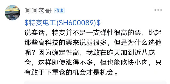 当然,或许还有更好,更有弹性的标的,但我从来都不会把弹性放在第一位,而是把确定性放在第一位,比如当初选特变的时候就是这样想的,只有敢于下重仓的机会才是机会。不过这次我不会把八成仓给券商了,我还想留点仓位捡漏比如我昨天提到的那几支牛票,给不给机会看主力的心情,北方稀土今天应该又要大涨了,我就不凑热闹了,要排队抢板的事我从来不干,到半山上去摘千年灵芝的事我也干不来,我胆小,我宁愿在山脚下捡点西瓜芝麻就好了。