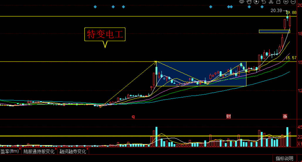特变昨天表现很抢眼,最低价18.64,高于18.5,最高价19.98,高于多空线19.86,可惜没有站稳多空线上,量能也没收在地量之下,这是还要洗盘,洗盘并不意味价格就要下跌,有时强势反包也是消除分歧的方法之一,这是强势的洗盘,昨天一朋友问我南大光电,我说是洗盘,分歧还在,这是因为量能还不够小,但昨天南大强势大涨反包前两根阴柱,过后我回看,发现前面两根阴柱是搓揉组合,就是我之前说过的上测天,下测地,没事洗洗该上路了,这是我疏忽了,该向那位朋友@晓197911 道歉。当然让我再次解读,我也不敢确认昨天会以强势反包的形式解决分歧,因此,特变今天如果强势反包周五的上影线,那也是洗盘结束的一种方式,我今天会再加仓,昨天也可以理解为一个回踩五日线的动作,我之前说喇叭口张开了,特变还站在喇叭上方,再上去就该下来了,那是超买状态,经过一个上影线,昨天再回踩五日线,趋势又回到正常的走势中,同时也可以理解为另一种方式的上测压力位,下测支撑位,今天一个低开踩在五日线上,然后一路高歌,这个可能性也不是没有![]()