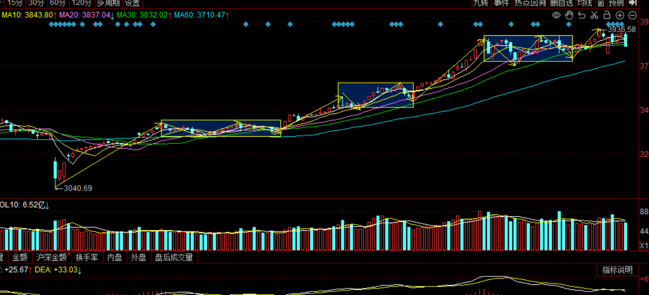 昨天三大指数一齐大跌,两市只有500+红,4800+ 绿,银行大红,成交额19380亿,跟周四差不多,这个地方缩量大跌是比较明显的买盘动力不足引起的,因此后市比较担忧,而能挽回如此不好局面的只有券商,因为券商代表着情绪和主力的意向,这和银行板块的方向完全相反,上证昨天一阴跌穿5,10,20,30日四条线,同时10.20日线拐头向下,如果周一再次收阴线,那五日线向下穿10,20日线,这是一个高位死叉,并且跌穿30日线了,这是一个中期调整信号,所以,各位家人们做好避险,该减仓减仓,该止盈止盈,尤其是高位科技股。
