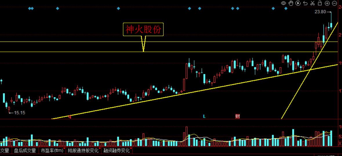 神火周五的最高价23.8,距离历史高位也只有一步之遥了,所以这时承压也在所难免,从图形来看,周四本来就偏离趋势线较远,我们在昨天早上的复盘还说神火要低开或横盘了,没想到横盘是横盘了,但剧本却完全不同,所以说,技术分析只能分析趋势,千万不要跟细节即时走向较真,否则吃亏的肯定是自己,下周一只要低平开就又回到趋势线上了,有人问,昨天的这根长上影假阴线会不会开始调整了,个人以为,趋势一旦形成,轻易是不会改变的,所以只要在趋势线上,他怎么走不必在意,破了线就要避险了。