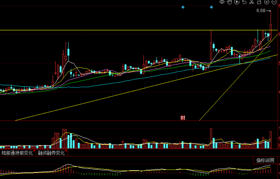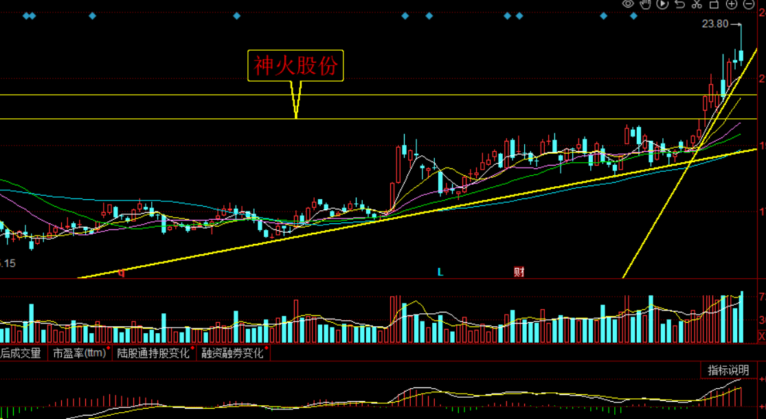 神火多次冲高回落,留下长上影,会不会开始调整了,上次复盘说过了,只要在趋势线上,我们姑且不去管他,等跌破趋势线再作防御动作还为时不晚,因为这道防线远比其他支撑位的安全系数要高得多,这也是我们不担心逃顶问题的根本所在,不过这里也不适合继续加仓,静观其变,持股待涨。