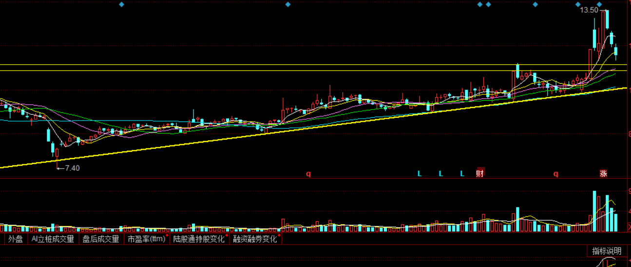 爱施德今天放量上冲,在13.36处回落,从图中可以看到前面的垂直供应柱就是13.36,因此这里有套牢盘,压力不小,放量无法突破那就可能回落调整了,如果爱施德仓位比较大,可以适当减仓应对,等待重新组织突破的力量再买入,实际就是高抛低吸,做隔日T,也降低风险。
