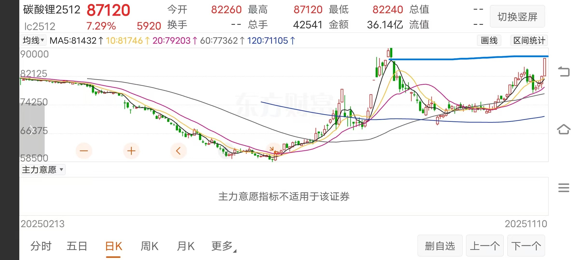 首先我们得先庆祝一下大的方向正确,因为碳酸锂期货的大涨就说明了问题,钟摆加快了返回六点钟的速度,而这时出现了什么问题,导致在期货大涨七个点的同时,股价冲高回落,赣甚至收阴线。既然是整个板块走同步,那说明这不什么个股的问题,而是跟整个板块有关的问题所致。于是我猜想这跟期货走势有关,我们可以看到在819碳酸锂价格走到阶段最高价九万,而后一个大大的跳空缺口,今天的收盘价刚好补齐这个缺口87120,那么市场难免会考虑,再一次冲击九万时,会不会再次遇到大的抛压,从而再次走低,而此时股票价格早已预期了九万之前的价格,此时再次冲击新高必然承压,那么我们就可以猜想,如果碳酸锂顺利突破九万,那么股价的升值空间也正式打开,因为期货的预期也同样打开了,过了九万,明显能看到十一万了,而此时如果在九万之前开始调整,那么股价必然引发一次比较大的调整。这是个人看法,留待后面见证。