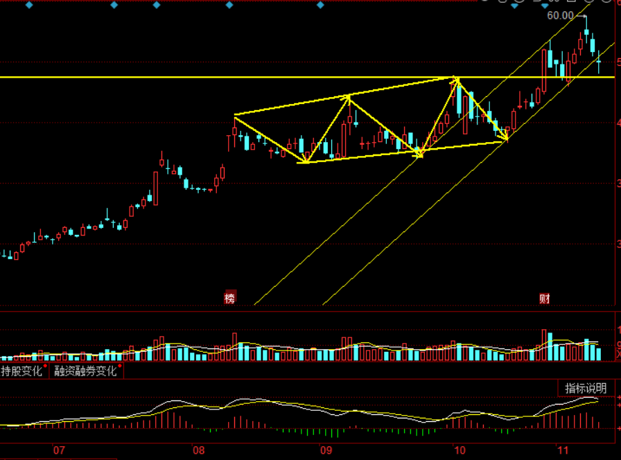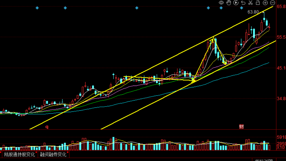 中矿我心里之前是认为会调整到趋势线下沿,然后再上来,但昨天收的缩量小十字星有承接的意思,并且如果赣锋表现出龙头的强势,那么中天应该能跟风走一走,从这里上去到轨线顶部刚好就是我们的目标价65,究竟是不是这样走,我们拭目以待。
