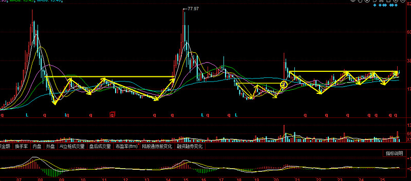 这段时间我主做中船防务,但却没给他画分析图,这在之前是没有过的,现在走得比较压抑,我就把我买入中船的逻辑讲出来,第一张图是中船的月K图,中船的大概全景图,出现三次月线W底或者三重底,前两次股价突破后最终都翻倍以上,记得上周五收盘前我讲过不能跌破十日线吗,因为跌破十日线就跌破颈线,也就是上个月突破失败,但是最终收在29.86,这是成功突破,因此这是有希望走月线三重底突破后的行情。