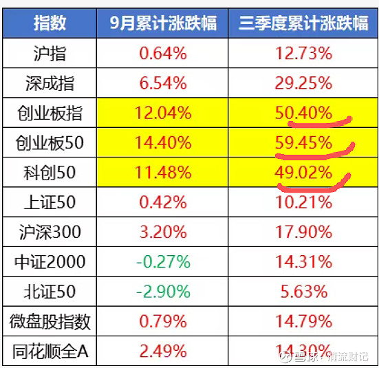 今天9月A股结束了,这个月指数很强啊,恒生科技、创业板、科创板领涨全球,包揽前三名了!如果算三季度,那更是见证奇迹的时刻。创业板累积大涨50.4%,这个涨幅历史第二高,仅次于2015年的一季度!科创50大涨49.02%,这是科创板史上最大的涨幅。
