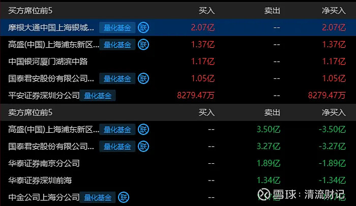最近这几天摩尔被全网讨伐,公司也发公告提示风险。股价走的一波三折,开盘一度近-20%,盘中快翻红,最终收盘-13%。从盘后龙虎榜看,4家量化席位买入5.32亿、3家量化席位卖出7.94亿。
