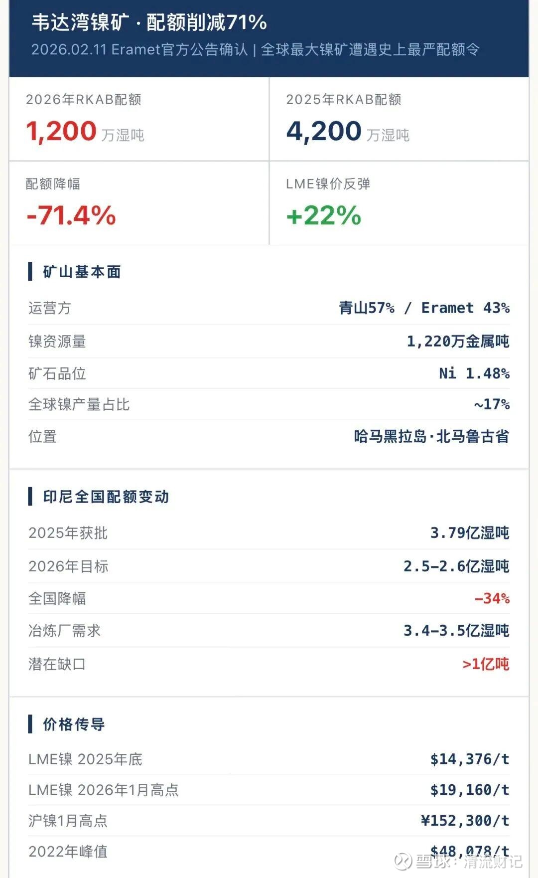 刚刚,全球矿业圈炸了!法国埃赫曼一纸公告,直接让LME镍盘后拉升3%:印尼政府把2026年韦达湾镍矿的开采配额,从2025年的4200万湿吨,砍到1200万湿吨。不是10%,不是20%。71%!膝盖以上全锯!这不是配额调整。这是全球第一大资源国,向市场正式宣战。