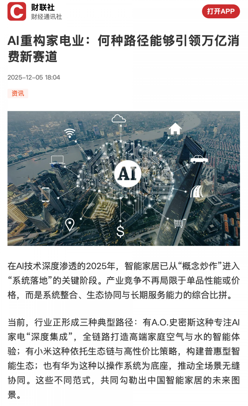 日前,权威财经媒体《财联社》发布了一篇题为《AI重构家电业:何种路径能够引领万亿消费新赛道》的深度报道,一针见血地指出:AI时代的家电竞争,早已超越了单品性能的内卷,进入了系统整合与生态协同的“阵地战”。