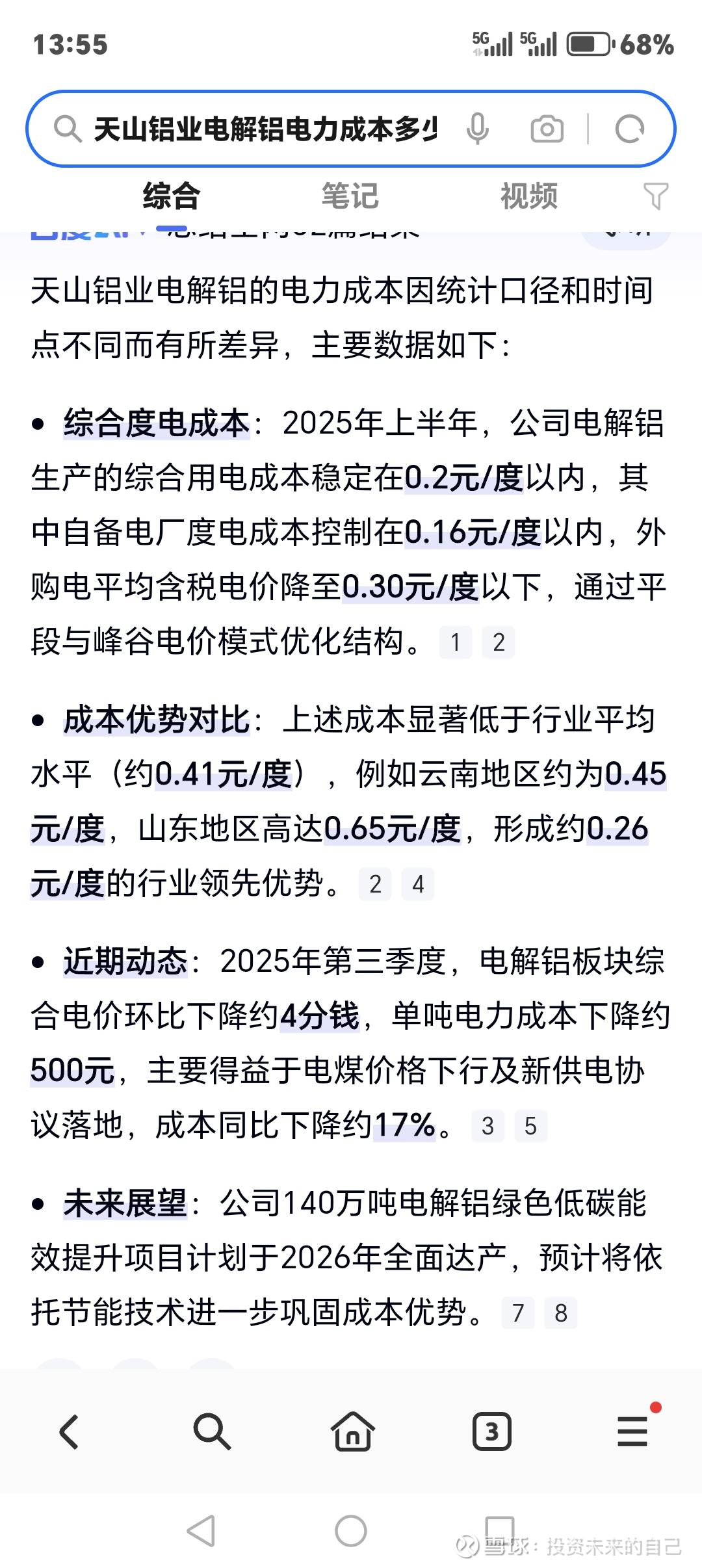 电解铝用电成本占比35~40%。天山铝业25年三季度综合电力成本0.2元/度,自备发电成本0.16元/度。显著低于铝企业用电平均成本0.41元/度。