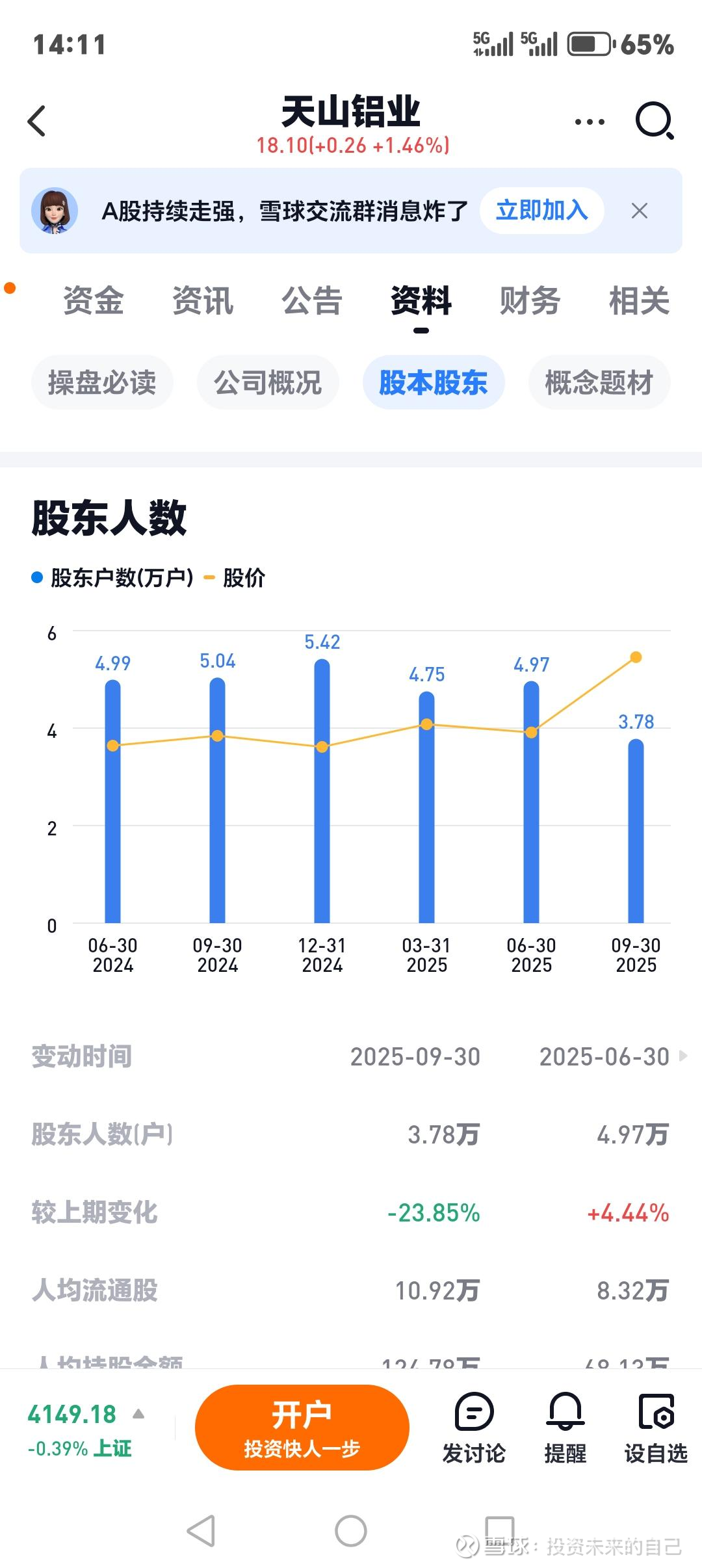 需要关注股东人数变化:24年6月30日,天山铝业股东人数4.99万人,25年6月30日股东人数4.97万人,25年9月30日股东人数3.78万人,从24年6月到25年6月一年时间股东人数几乎没有变化,最近从25年6月到9月减少了1.19万人。是谁拿走了这1.19万人的筹码?预测是主力庄家。25年四季报股东人数还没有公布。现在天山铝业股价处于历史高位,需要随时注意调整风险了。