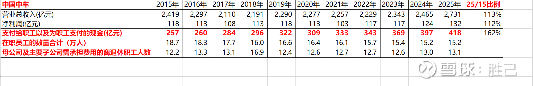 中国中车,2025年与2015年同比,营业收入+13%、净利润+12%、职工薪酬+62%。