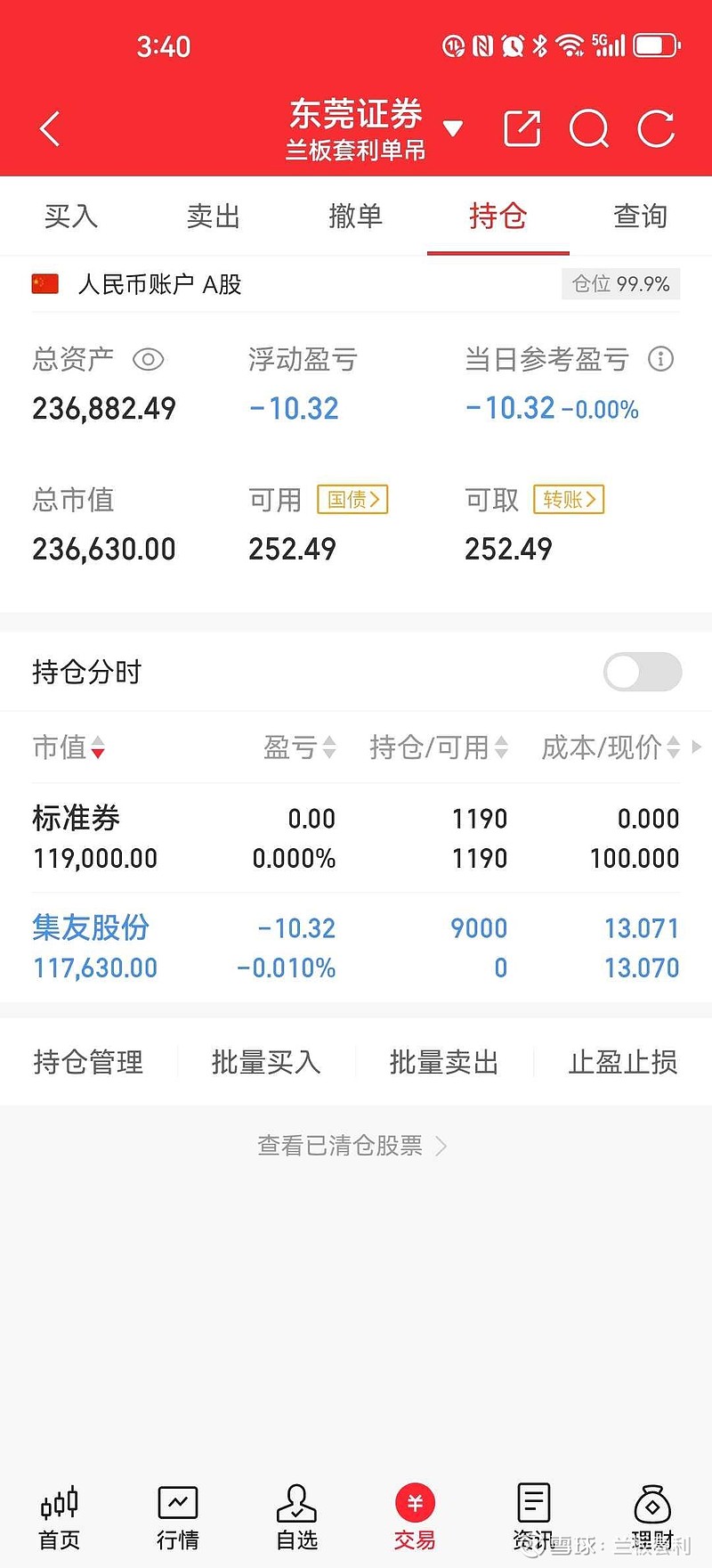 今天下午继续给兄弟们表演胸口碎大石,单吊集友股份,其实大盘恐慌不恐慌和我没有什么关系,我只关注自己的交易系统,符合审美模式就果断出击,哪怕大盘跌停,该出击一样不会手软,大盘涨停,没标的,也会管住手,我是一位职业选手,只对自己的账户曲线负责,不会受外界的各种干扰,别人做的怎么样,我也不会去关心,大盘怎么样,我也不会太关心。$集友股份(SH603429)$