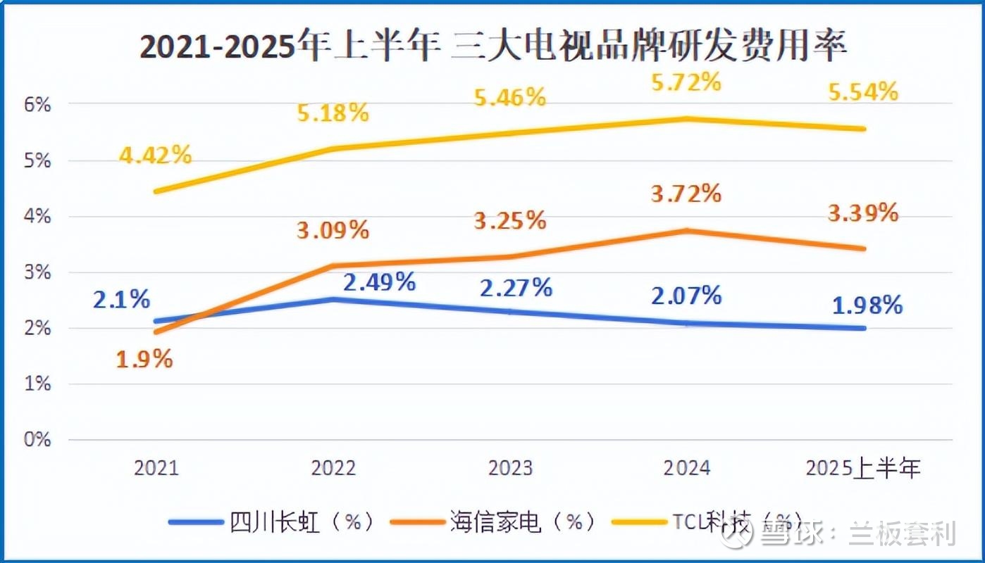 而四川长虹在面对 MiniLED 电视的爆发时反应迟钝,2021 - 2025 年上半年,相比于海信和 TCL,四川长虹在研发上的投入力度欠缺,2% 左右的研发费用率显著低于前两家企业,这导致其未能及时推出具有竞争力的 MiniLED 产品。尽管 2025 年上半年其 MiniLED 产品销量同比增长 110.2%,但仍落后于头部品牌。