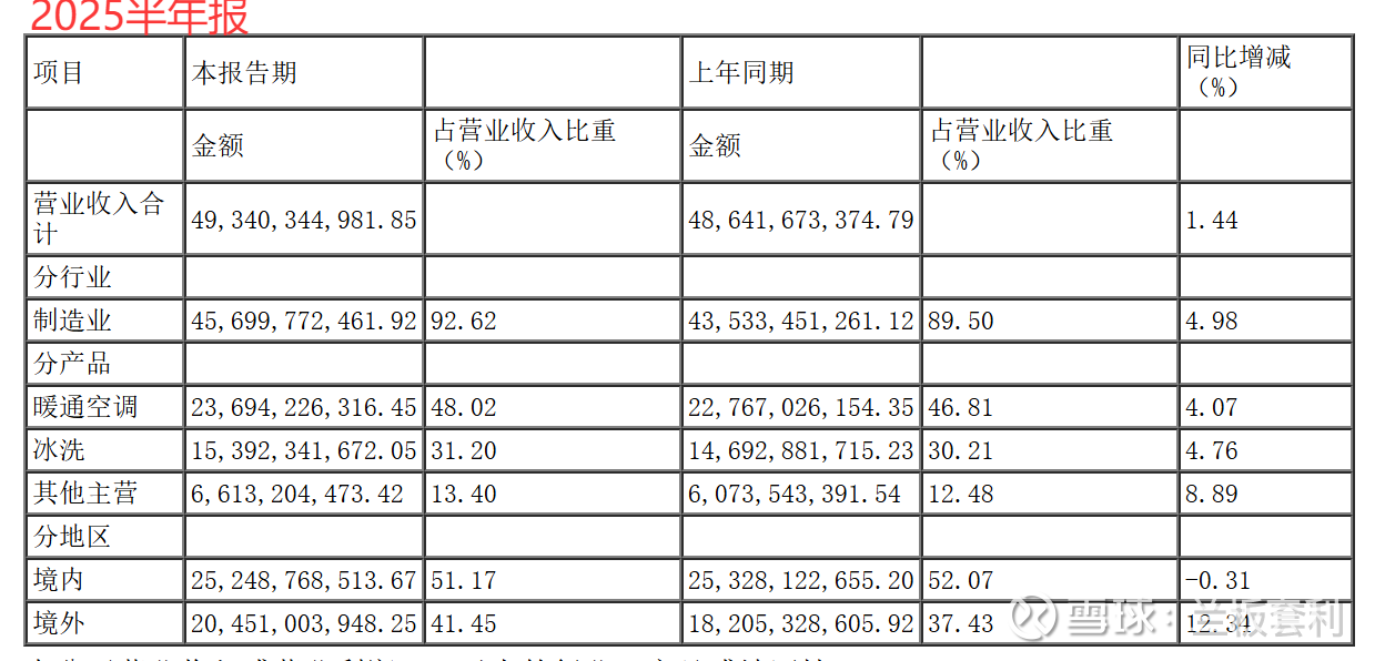 从业务板块来看,2025 年上半年,暖通空调业务营收为 237 亿元,同比增长了 4.07%;冰洗业务为 154 亿元,同比增长 4.76%;其他业务为 66 亿元,同比增长了 8.89% 。境内营收为 252 亿元,微跌 0.31%;境外营收为 205 亿元,增长了 12.34% 。境外业务的快速增长,成为海信家电业绩的重要支撑。