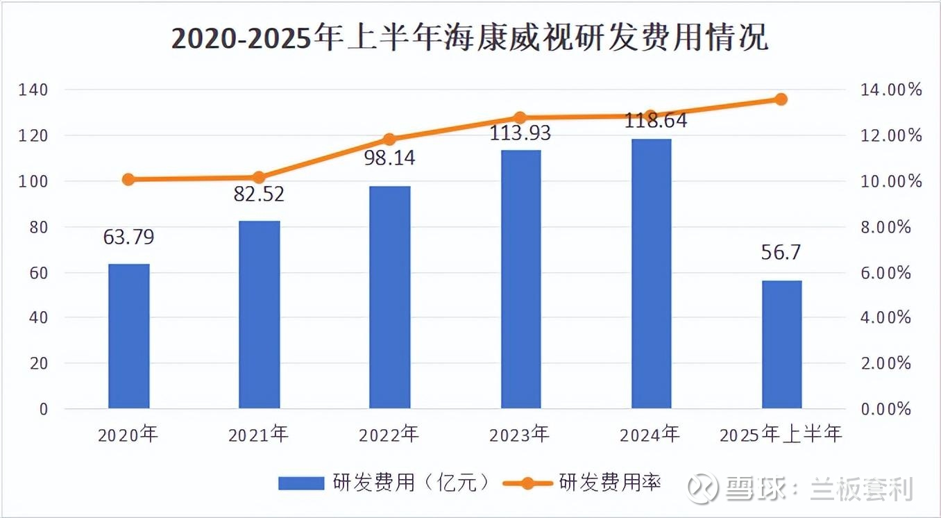 面对困境,海康威视没有退缩,而是选择了主动出击,豪掷 500 亿进行研发投入,展现出了强大的决心和魄力。从 2020 年到 2025 年上半年,海康威视的研发投入持续增加,2020 年研发费用为 63.79 亿元 ,2021 年增长至 82.52 亿元 ,2022 年进一步增长至 98.14 亿元 ,2023 年达到 113.93 亿元 ,2024 年研发费用为 118.64 亿元。研发费用率也从 2020 年的 11% 提高至 2024 年的 12.8% ,在 2025 年上半年,研发费用占营收的 13.56% ,研发投入力度之大,在 A 股上市公司中名列前茅。