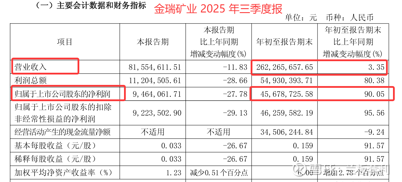 最近,金瑞矿业可谓是在资本市场上赚足了眼球!10 月 28 日晚间,金瑞矿业发布 2025 年第三季度报告,数据显示,2025 年前三季度公司实现营业收入 2.62亿元,同比增长 3.35%;而归属于上市公司股东的净利润为 4568万元 ,同比增长幅度竟然高达 90.05%!这一成绩,直接让金瑞矿业成为了近期投资者和行业专家们热议的焦点。在当前经济环境复杂多变,不少企业都在艰难求存的情况下,金瑞矿业这份亮眼的成绩单,无疑像是一颗投入平静湖面的巨石,激起千层浪。那它究竟是如何做到的呢?接下来,咱们就深入剖析一下金瑞矿业背后的发展逻辑 。