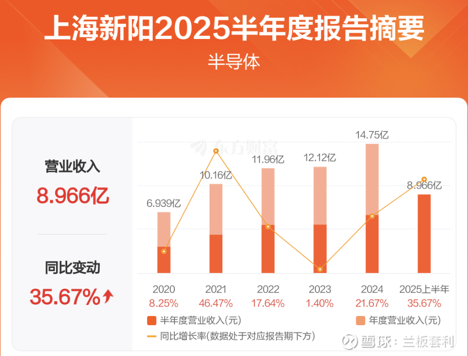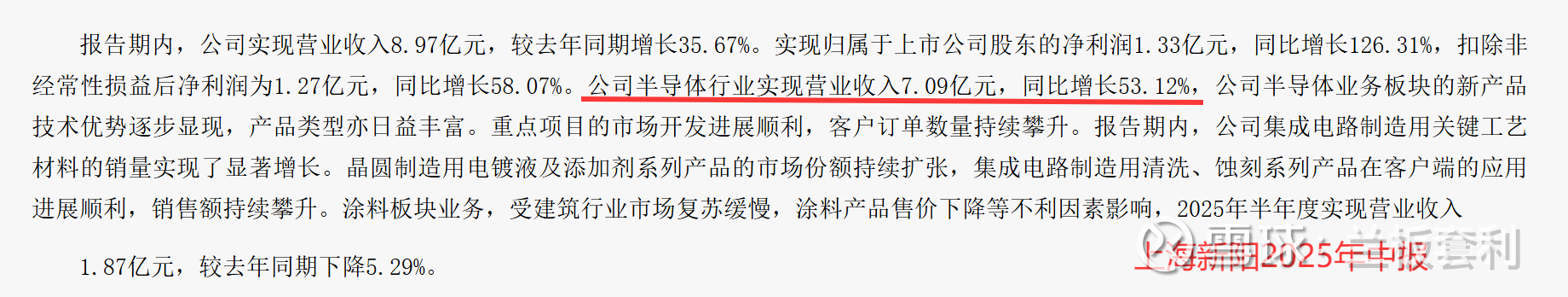 时间来到 2025 年上半年,上海新阳的强劲增长势头丝毫未减,实现营收 8.97 亿元,同比增长 35.67%,再次展现出其蓬勃的发展活力。而在这亮眼的营收数据背后,半导体业务无疑是最大的功臣。该业务收入达到 7.09 亿元,占比突破 79%,增速更是高达 53.12%,成为推动公司业绩增长的核心引擎。