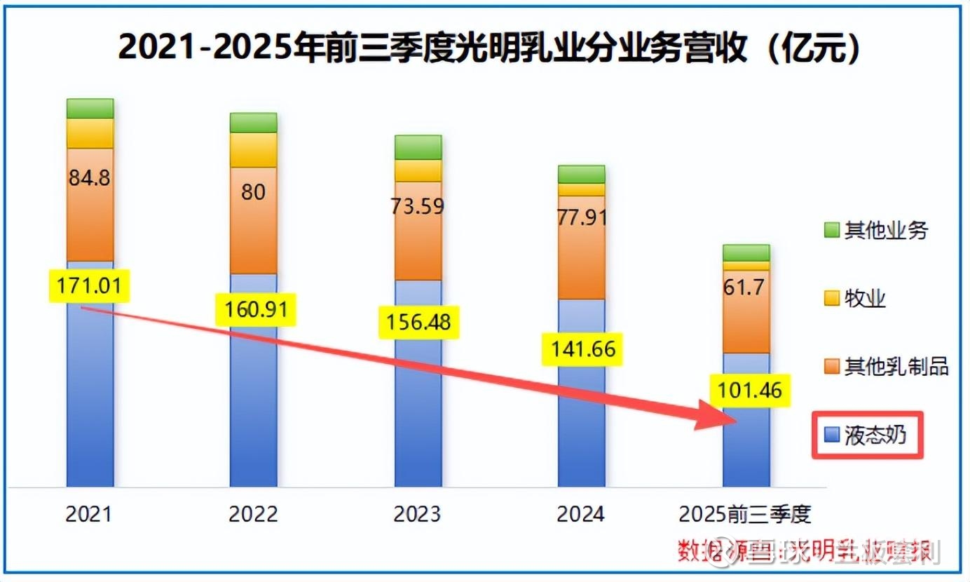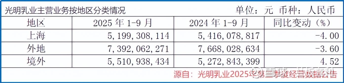 2025 年前三季度的营收数据,就像一面镜子,清晰地映照出光明乳业区域依赖的弊端。上海作为其大本营,贡献了 52 亿元的营收,然而却同比下滑了 4%;全国其他地区的营收为 74 亿元,同样未能幸免,同比下降 3.6%。这一降一落之间,不难看出单一市场波动对光明乳业业绩的巨大冲击。