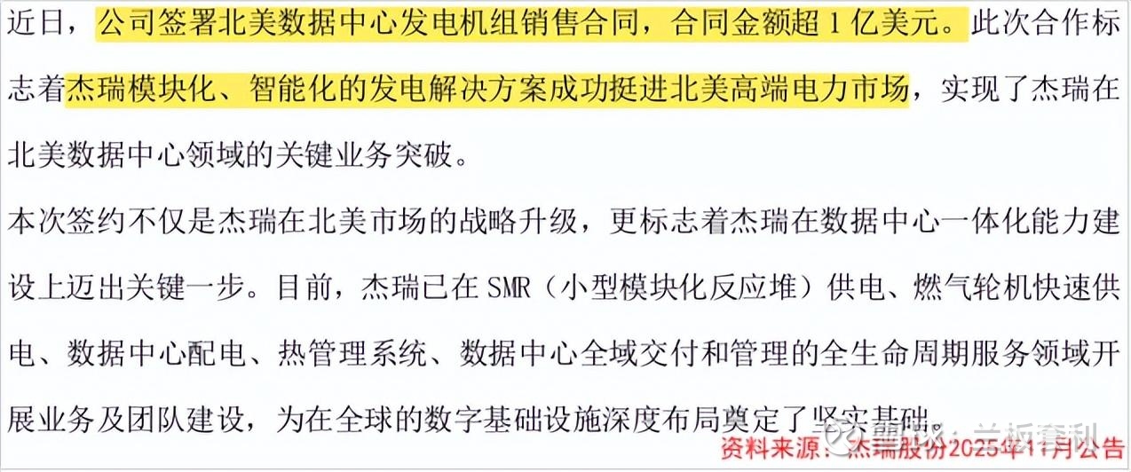 在 2025 年 11 月 27 日,杰瑞股份发布一则重磅消息,其全资子公司杰瑞敏电能源集团与全球 AI 行业巨头正式签署发电机组销售合同,合同金额超 1 亿美元。这看似普通的一笔交易,实则蕴含着巨大的战略意义。