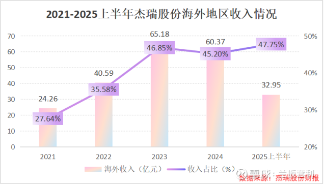 1.市场占有率的跃迁式增长 杰瑞股份在海外市场的深耕细作取得了显著成效,海外收入占比实现了跃迁式增长。从 2021 年的 27.64% 飙升至 2025 上半年的 47.75%,这一数据直观地反映了杰瑞股份在国际市场上的影响力不断扩大 。