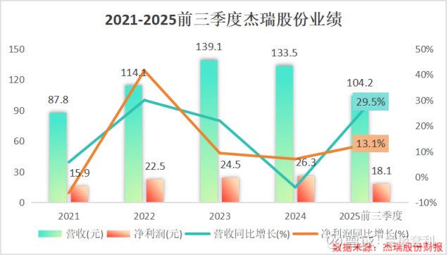 2025 年前三季度,杰瑞股份展现出强劲的发展势头,实现营业收入 104.2 亿元,同比增长 29.5%,净利润达到 18.1 亿元,同比增长 13.1%。这一成绩不仅扭转了去年增速下滑的局面,更彰显了公司在市场竞争中的强大韧性。