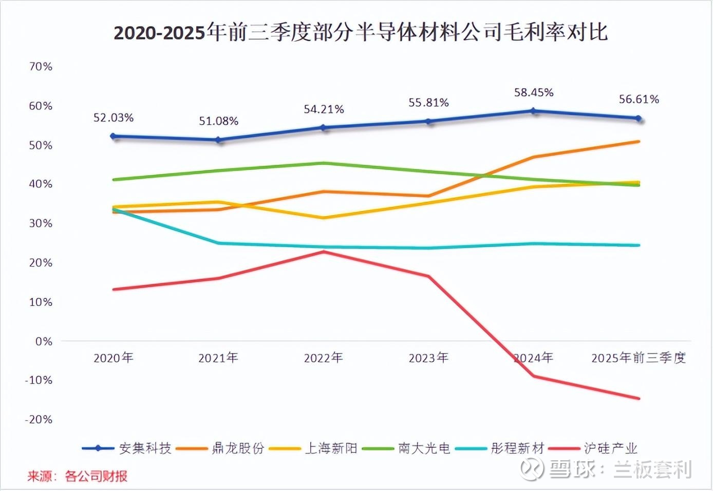 在半导体材料这片竞争激烈的 “战场” 上,安集科技自 2020 年以来,就像一位戴着金色王冠的王者,其毛利率始终稳稳地站在 50% 以上的高地。2024 年,安集科技毛利率达到了惊人的 58.45% ,2025 年前三季度毛利率为 56.61%。这一数据,犹如一颗璀璨的明星,在半导体材料领域的夜空中格外耀眼,将众多同行远远地甩在了身后。
