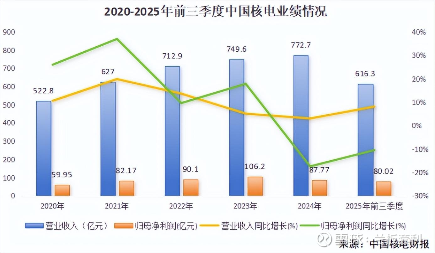 从装机容量和发电量来看,截至 2024 年底,中国核电控股在运核电机组 25 台,装机容量达 2375 万千瓦 ,全年核电发电量 1831.22 亿千瓦时 ;而中国广核在运核电机组数量为 28 台,总装机容量达到 3175.6 万千瓦 ,全年总发电量则达到 2421.81 亿千瓦时 ,上网电量 2272.84 亿千瓦时,占全国核电总发电量约 40% 。在营收和利润方面,2025 年前三季度,中国核电实现营收 616.3 亿,超过了中国广核的 597.2 亿 。但从盈利稳定性和毛利率来看,2020 - 2025 年前三季度,中国核电的毛利率维持在 44% 左右,始终领先于中国广核 。不过,中国广核凭借其稳定的运营模式和技术优化,在成本管理上具备一定优势,这也为其在市场竞争中奠定了价格基础。