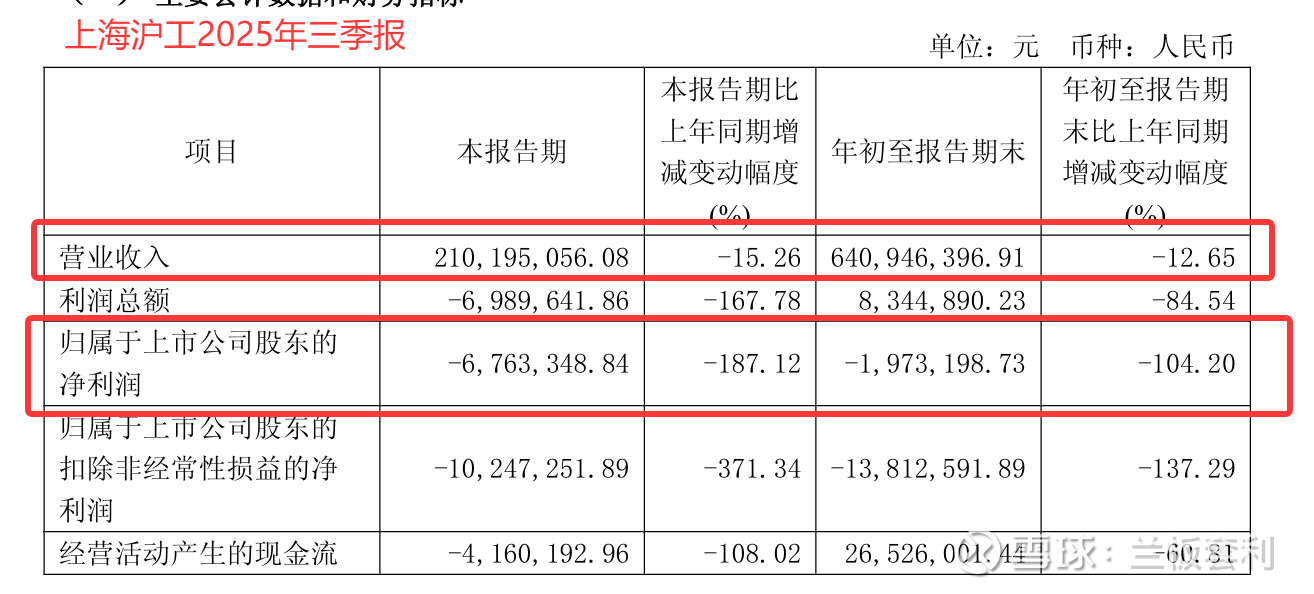 在资本市场的浪潮中,每一家企业的财务数据都是其发展状况的直观映射。上海沪工,这家在行业内颇具影响力的企业,2025 年前三季度的财务报表一经公布,便引发了广泛关注。数据显示,其营业总收入为 6.41 亿元,与去年同期相比,下滑了 12.65% ,归母净利润更是陷入亏损泥沼,达到 - 197.32 万元,同比下降幅度高达 104.2%。这样的数字,犹如一记重锤,让市场对上海沪工的未来发展前景产生了诸多疑虑。
