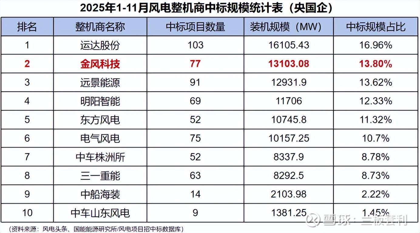 在国内风电市场,金风科技的表现同样可圈可点,展现出了强大的市场竞争力和深厚的行业底蕴。2025 年 1-11 月,在竞争激烈的央国企风机项目招标中,金风科技凭借其卓越的技术实力、丰富的项目经验和良好的市场口碑,累计中标规模达到了惊人的 13103.08MW,占比 13.8%,高居行业第二 。这一成绩的取得,绝非偶然,而是金风科技长期以来在技术研发、产品创新和市场拓展等方面持续投入和深耕的结果。