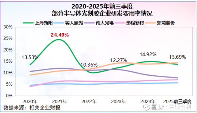 对比同行,鼎龙股份与南大光电在 2020 - 2024 年间年均研发费用率大约维持在 11% 左右 ,而彤程新材的年均研发费用率更是仅在 5% 左右 。高下立判,上海新阳以远超同行的研发投入强度,在半导体材料领域走出了一条 “技术主导” 的差异化发展道路。