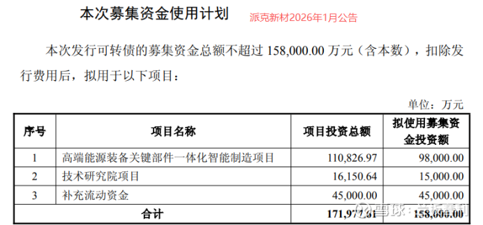 2026 年 1 月,派克新材抛出了一份重磅计划,拟发行不超过 15.8 亿元的可转换公司债券,这一举措犹如在行业内投下了一颗 “深水炸弹”,引发了广泛关注。此次募集资金将精准投向三大核心领域,为公司的未来发展注入强大动力 。
