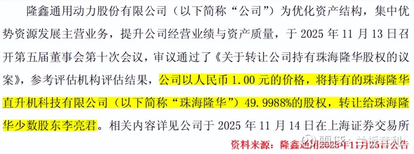 仅仅 11 天后,11 月 25 日,隆鑫通用又做出了一个令人震惊的决定:拟以 1 元人民币的象征性价格,转让所持珠海隆华的全部股权,暂时退出无人机业务 。珠海隆华作为隆鑫通用投资的无人机业务平台,成立 12 年来,仅有 3 年实现微利,长期处于经营亏损状态 。截至 2025 年 10 月 31 日,珠海隆华账面净资产为 - 6735.17 万元,已深陷 “资不抵债” 的困境 。此次转让,不仅避免了珠海隆华继续亏损对公司业绩的负面影响,还为公司回笼了一定的资金。