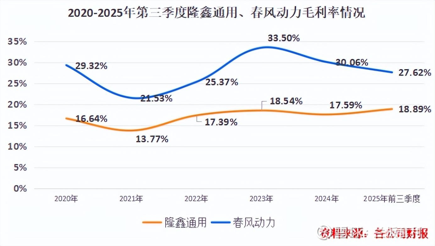 随着高毛利产品的不断放量,2025 年前三季度,隆鑫通用的毛利率提升至 18.89% ,同比增加了 3.26 个百分点。这一提升,不仅反映了公司产品结构的优化,也表明了公司在成本控制与运营效率方面取得了显著成效。与春风动力的毛利率差距进一步缩小,也让隆鑫通用在市场竞争中更具底气。
