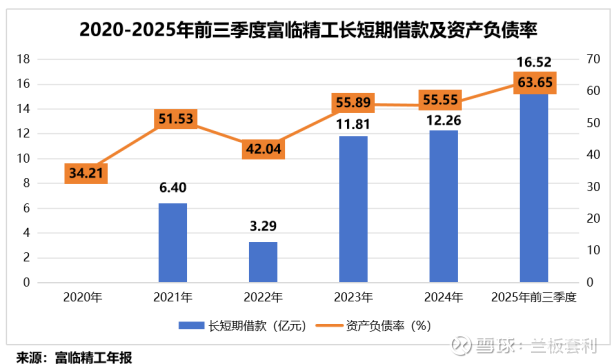 一方面是资金压力凸显。持续的研发投入与产业布局,让公司负债规模有所上升。截至2025年三季度末,富临精工长短期借款高达16.52亿元,资产负债率从2020年的34.21%大幅攀升至63.65%,负债比例显著上升,后续资金周转压力值得关注。