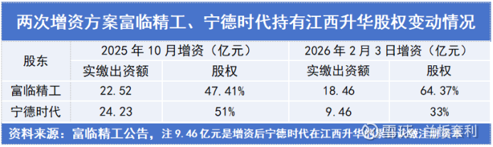 第二项动作,则是深化与行业龙头宁德时代的绑定。富临精工与宁德时代拟共同对江西升华进行增资扩股,其中富临精工将所持5亿元债权转作增资,宁德时代以现金7.47亿元增资。增资完成后,富临精工对江西升华的持股比例将从79.57%降至64.37%,宁德时代持股比例则从18.74%提升至33%。
