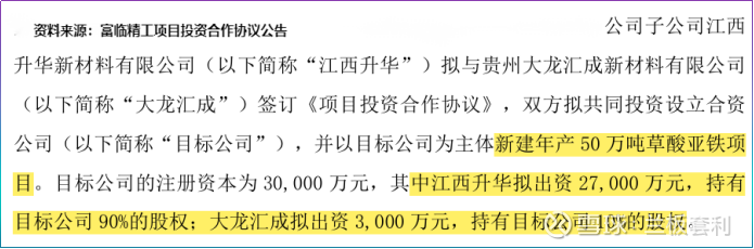 第一项重磅布局,聚焦锂电正极材料上游核心原料——草酸亚铁。公告显示,富临精工子公司江西升华拟与贵州大龙汇成共同出资,设立注册资本3亿元的合资公司(江西升华持股90%,大龙汇成持股10%),并以该合资公司为主体,投建年产50万吨草酸亚铁项目,项目总投资高达15亿元,计划于2026年9月30日前建成投产。