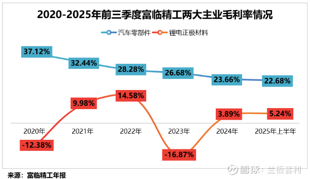 公开数据显示,锂电正极材料早已成为富临精工的“第一增长引擎”。2025年上半年,公司锂电池正极材料业务实现销售收入38.37亿元,占总营收的66%,稳稳占据营收支柱地位。但与此同时,该业务也面临着盈利承压的困境——同期锂电池正极材料毛利率仅为5.24%,远低于公司汽车零部件相关业务22.68%的毛利率,形成鲜明反差。