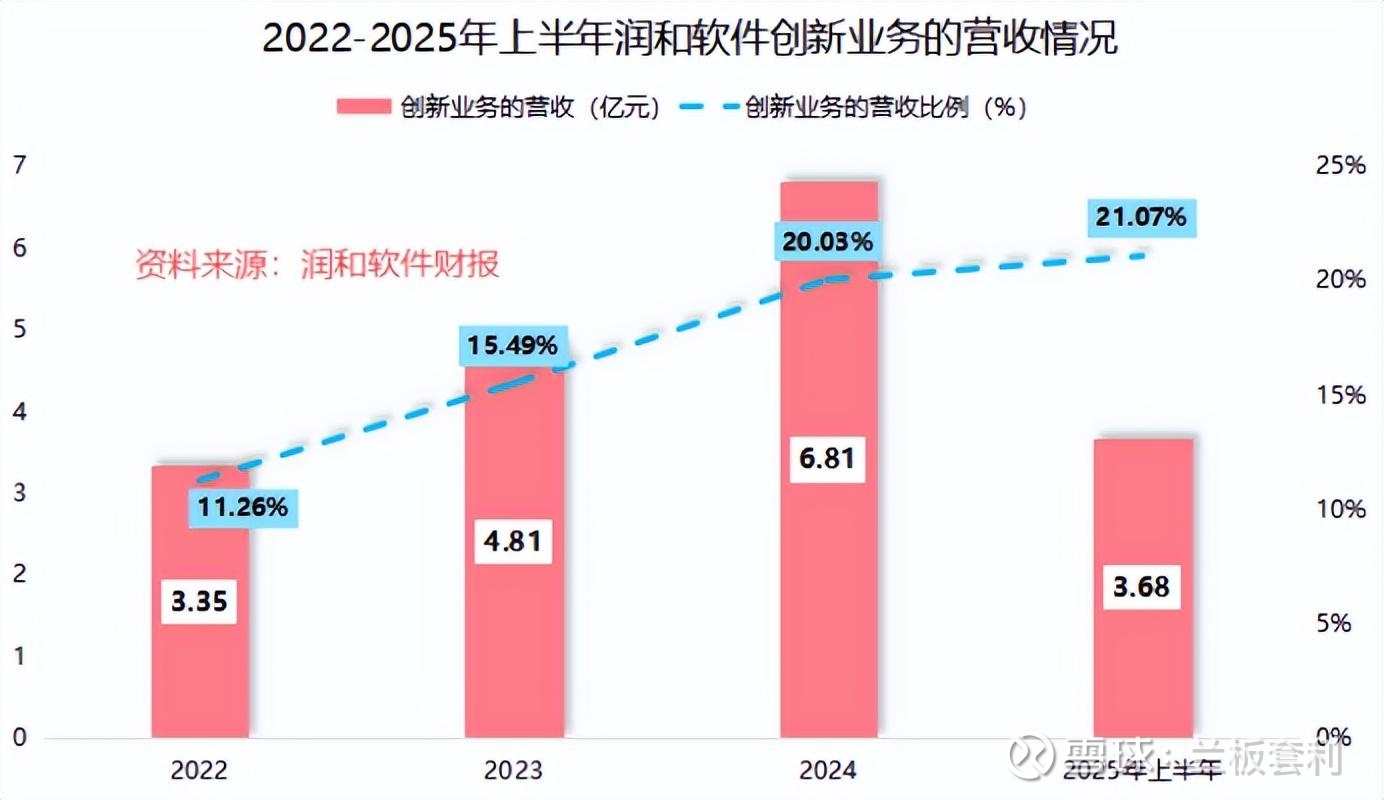 2025年上半年的业绩数据,直观展现了创新业务的强劲增长势头。数据显示,这一时期,润和软件以开源鸿蒙、开源欧拉及AI技术为核心的创新业务,实现销售收入3.68亿元,同比增长8.96%(约9%),占公司当期总营收的比例提升至21.07%。这一占比的提升,意味着公司业务结构正在持续优化,创新业务已从“补充力量”成长为“核心支柱”。