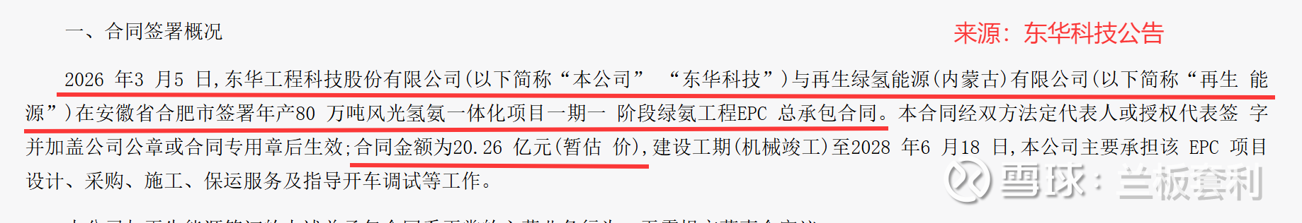 2026年3月5日,东华科技与再生绿氢能源(内蒙古)有限公司在安徽合肥正式签署绿氨EPC总承包合同,这一重磅合作引发行业广泛关注。据悉,该合同暂估金额达20.26亿元,最终将以双方审定的设计概算为基准转为固定总价,合同规模位居公司近期签约项目前列。