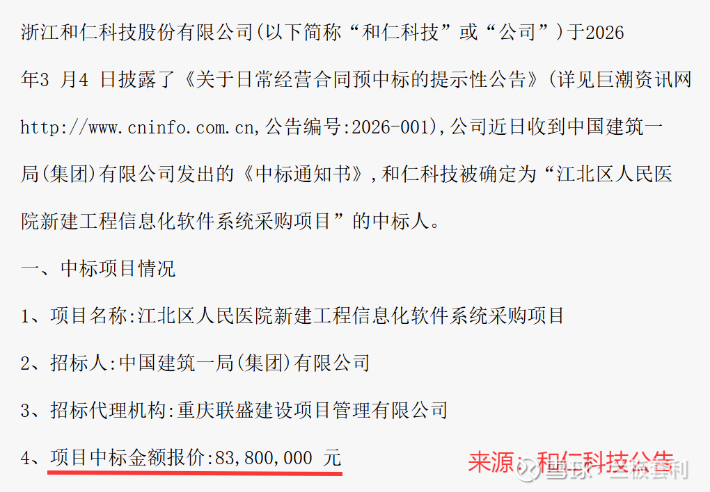 对于医疗信息化企业而言,大额订单的落地不仅是业务实力的直接体现,更是业绩增长的重要支撑。近日,和仁科技正式官宣,成功中标江北区人民医院新建工程信息化软件系统项目,中标金额高达8380万元,一举成为公司近期最受关注的核心利好。