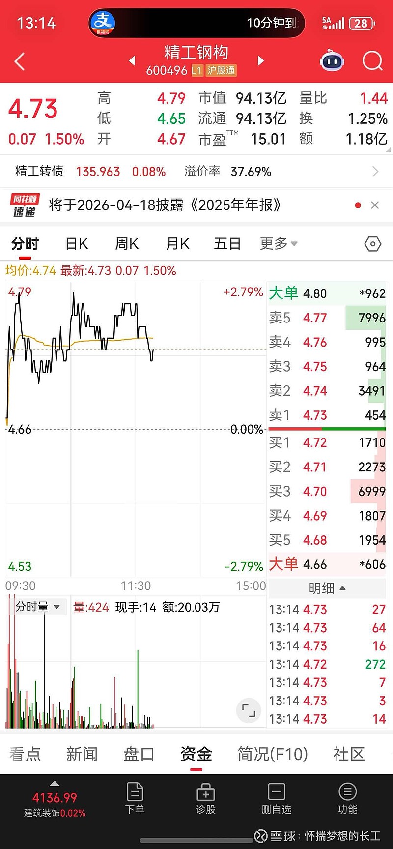$精工钢构(SH600496)$ $贵州茅台(SH600519)$ 精工钢构(SH600496) 创新高后未能稳住,持续有百手抛盘。我目前持仓600手,若跌破4.6元便跟风抛出500手,绝不恋战。当前未现主升行情,中期高点概率较低。若大盘走弱,深度洗盘未必是坏事。(PS:今日地价再创新低1325元,暂观望,等方向明确。若跌破1300元,先左侧交易买入2亩,其余等右侧趋势确认后再操作,不急。)