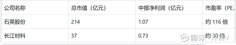 长江材料市值仅为石英股份的14.5%,但中报净利润达到了石英股份的68%。