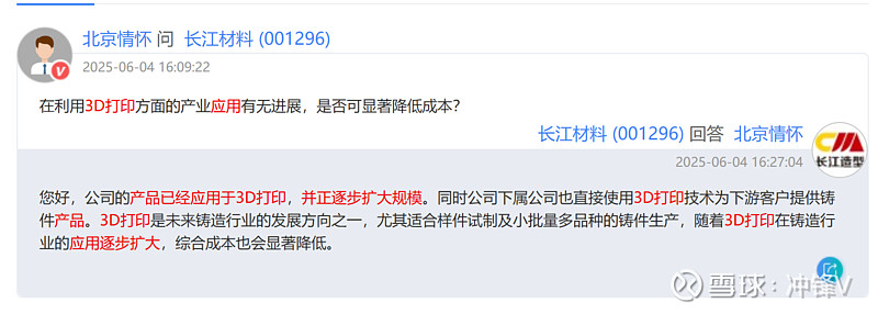 长江材料在3D打印领域已取得显著进展,据互动易回复,公司产品已应用于3D打印,并逐步扩大规模。