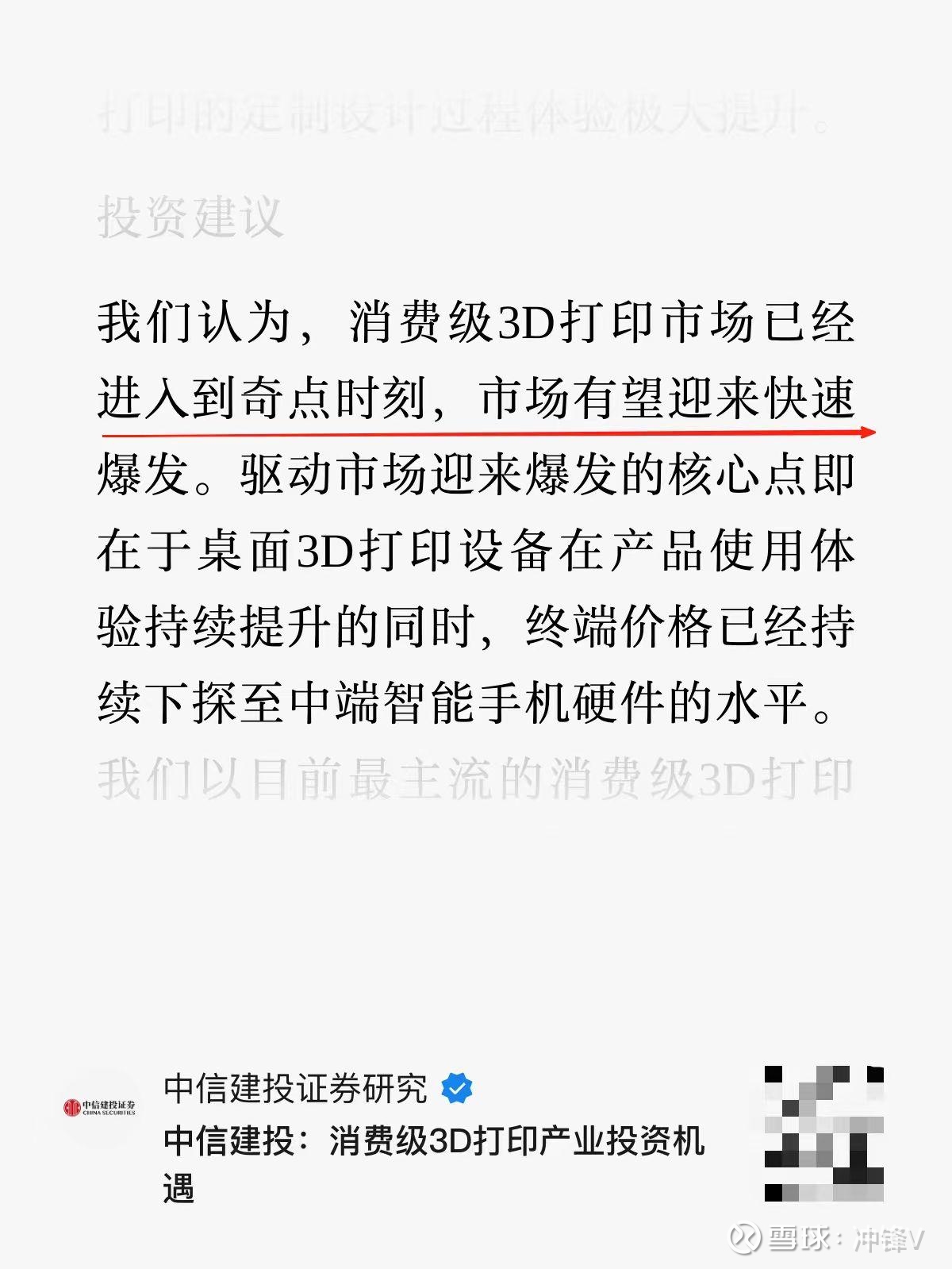 据中信建投证券,消费级 3D 打 印市场已经进入到奇点时刻,市场有望迎来快速爆发。近期拓竹等公司新品发布,引爆市场热度!